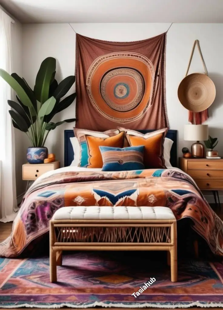 Combine creative bedroom aesthetics with bold eclectic bedroom touches like mismatched prints, carved wooden furniture, and hanging planters. Enhance the space with Asian boho bedroom details like mandala prints and bamboo blinds for a serene yet vibrant look.