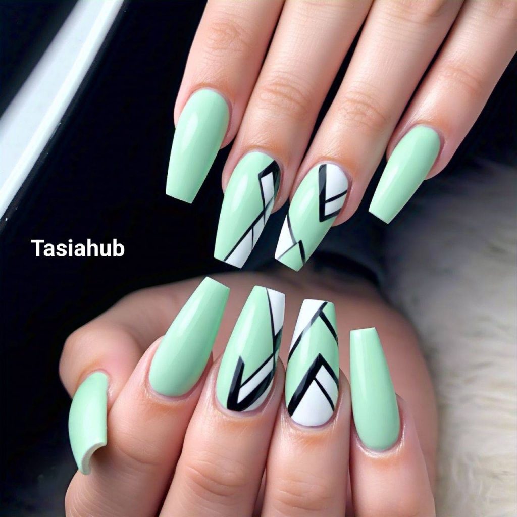 Combine mint green nails with bold black and white nail designs for a modern geometric look. Featuring crisp lines and abstract shapes, this set is great for unique acrylic nails. These coffin-shaped nails balance edgy and chic, perfect for anyone seeking basic nail inspiration.