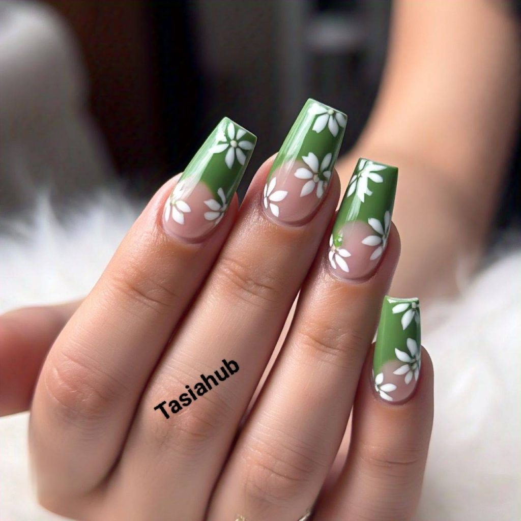 Pair green acrylic nails with white floral nail designs for a fresh spring vibe. These cute simple nails are great for outdoor weddings or brunch with friends. The mix of vibrant green and delicate flowers ensures basic nail inspiration with a twist.