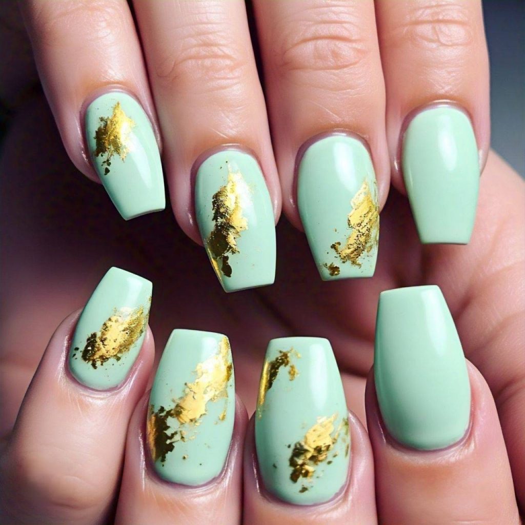 These mint green nails are accented with gold foil for a luxurious yet understated look. Ideal for spring acrylic nails, they merge simple nails coffin shape with an elegant twist. The metallic details add a touch of sophistication to this cute simple nails design.