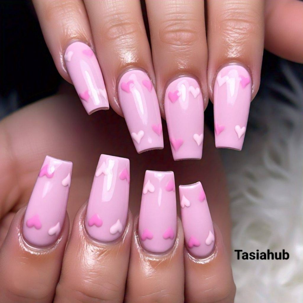 These acrylic nails coffin pink are accented with tiny pearls for a coquette-inspired vibe. Perfect for Valentine’s nails or nails acrylic with bow, they combine simplicity with elegance. A glossy finish adds the final touch.