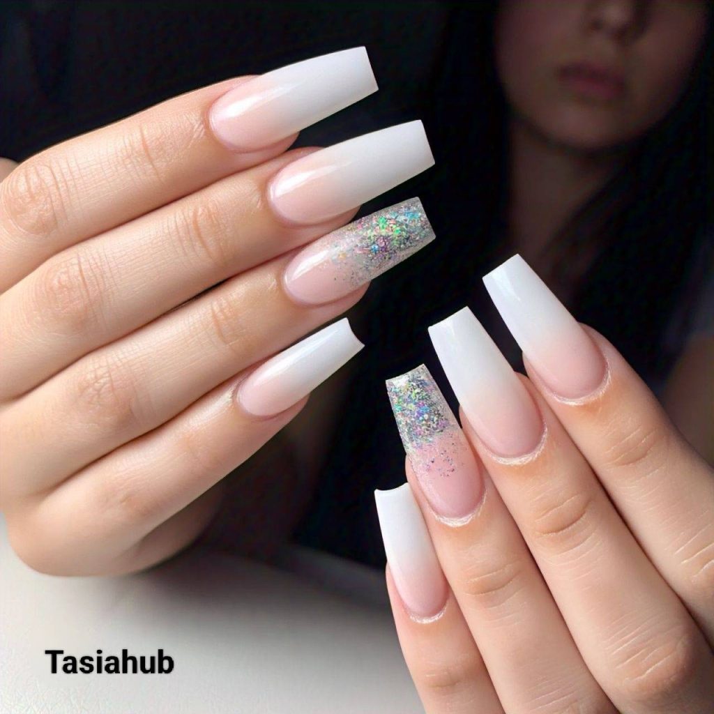 These French tip acrylic nails blend milky white with glitter ombre accents for a fresh take on white acrylic nails. Perfect for beach inspo nails or graduation nails, the milky nails effect adds subtle sophistication. Simple yet striking, they suit any occasion.
