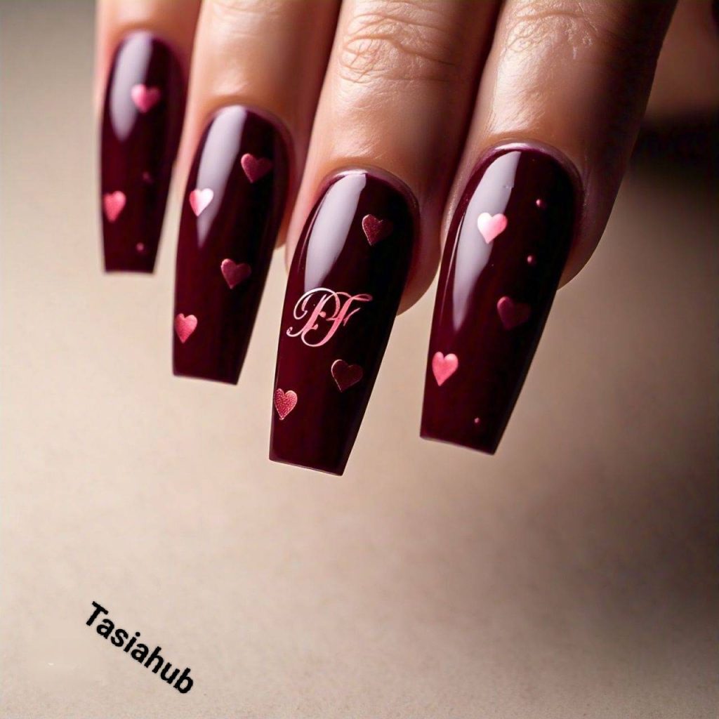 Coffin dark red nails with your BF’s initials create a personalized yet classy vibe. Pair the initials with tiny hearts or stars for a romantic touch. The deep red tones give these cute acrylic nails an elegant base to work with. Ideal for anniversaries or date nights, these nails are truly unique.
