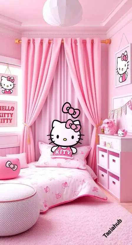 Embrace the charm of Hello Kitty rooms by dedicating your space to her iconic style. Incorporate pink room decor like a Hello Kitty-themed bedding set, curtains, and wall art.